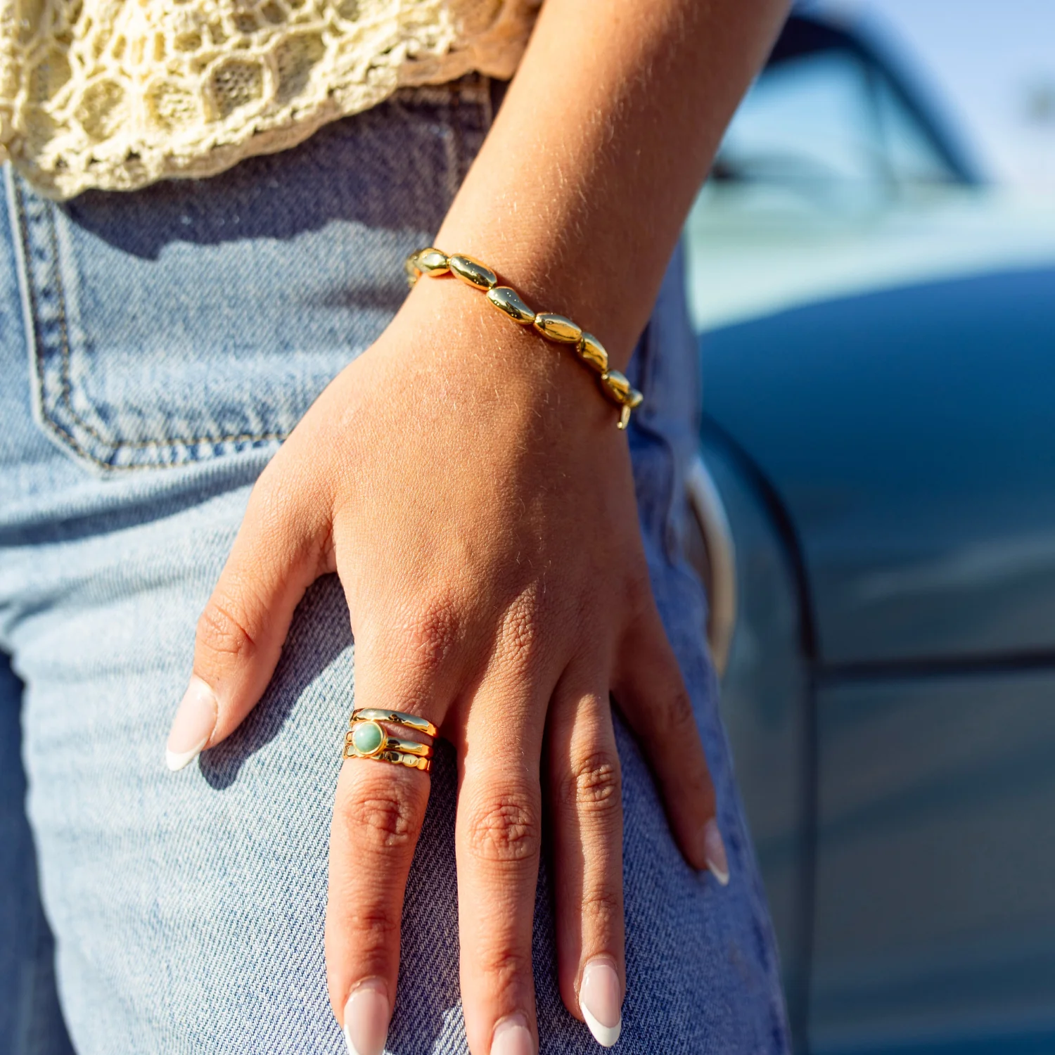 The Gold Plated Beaded Bracelet is a simple staple with a naturally worn-in feel. Featuring organic gold-plated beads with subtle texture and shape, it reflects the raw, sun-warmed beauty of the coast. Strung on a sturdy clear elastic string for effortless slip-on wear, it’s designed to be stacked, layered, and lived in every day.