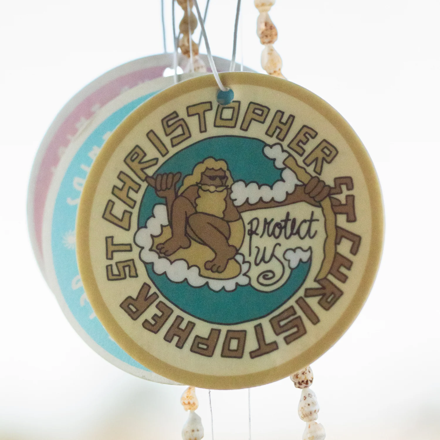 Keep your ride smelling fresh with our Retro St. Christopher Air Freshener! Featuring a custom design of St. Christopher surfing and hanging loose, this air freshener is the perfect blend of good vibes and protection on the go. Infused with the classic scent of coconut surf wax, it brings a touch of the beach wherever you are.