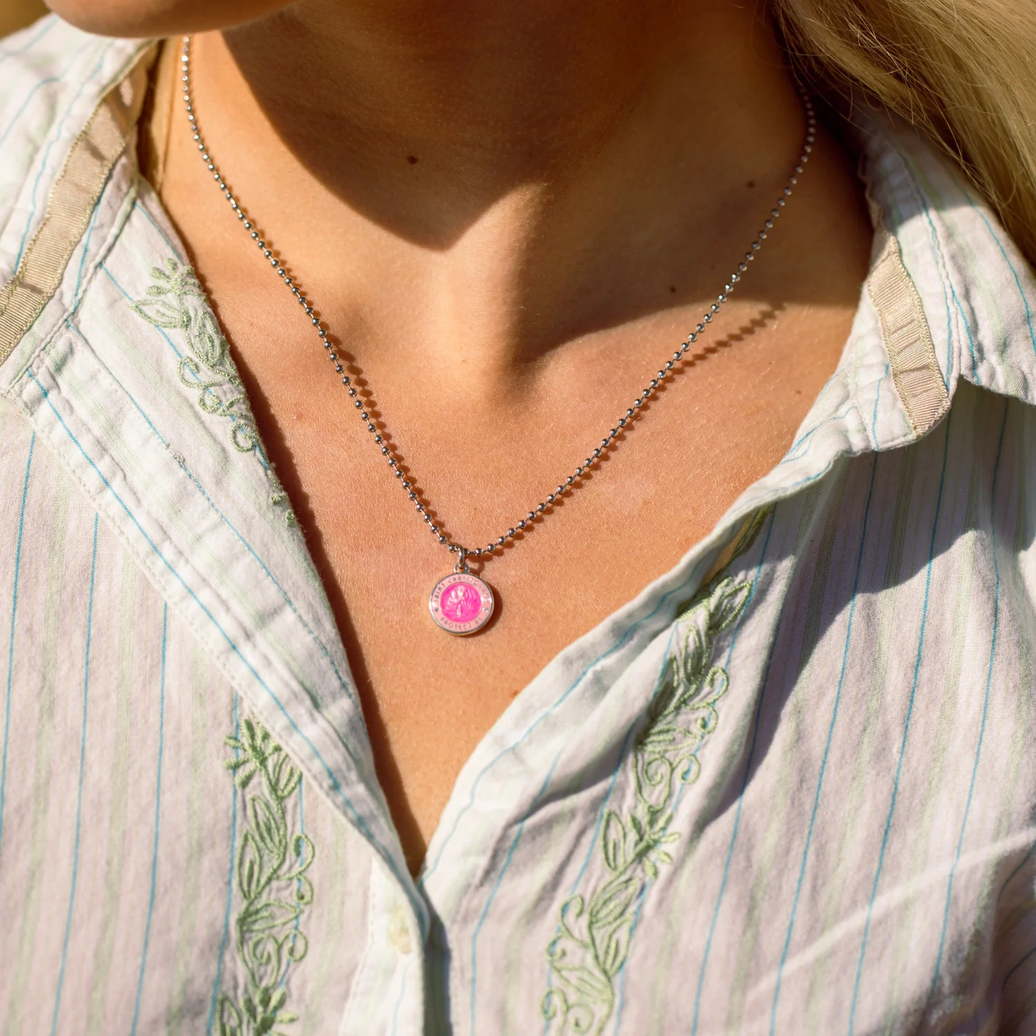 Take a piece of Southern California home with our cute and durable "St Christopher Necklace". Vibrant hot pink and blush to add to your stack :)